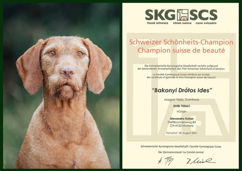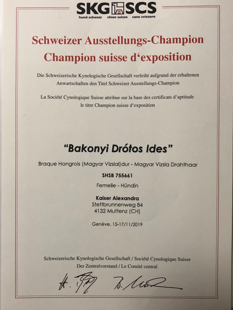 Da Bea am 26. Dezember 2017 unverhofft verstarb liegt es mir umso mehr am Herzen den Namen Bakonyi-Drotos in den Stammbäumen weiterzutragen. Ides übertrifft sowohl in der Leistung wie auch in der Gesundheit und im Wesen meine Erwartungen.Sie ist eine tolle sehr freundliche Hündin.Neben ihrer Arbeitsfreude und Finderwillens hat sie ein sehr angenehmes und ausgeglichenes Wesen.