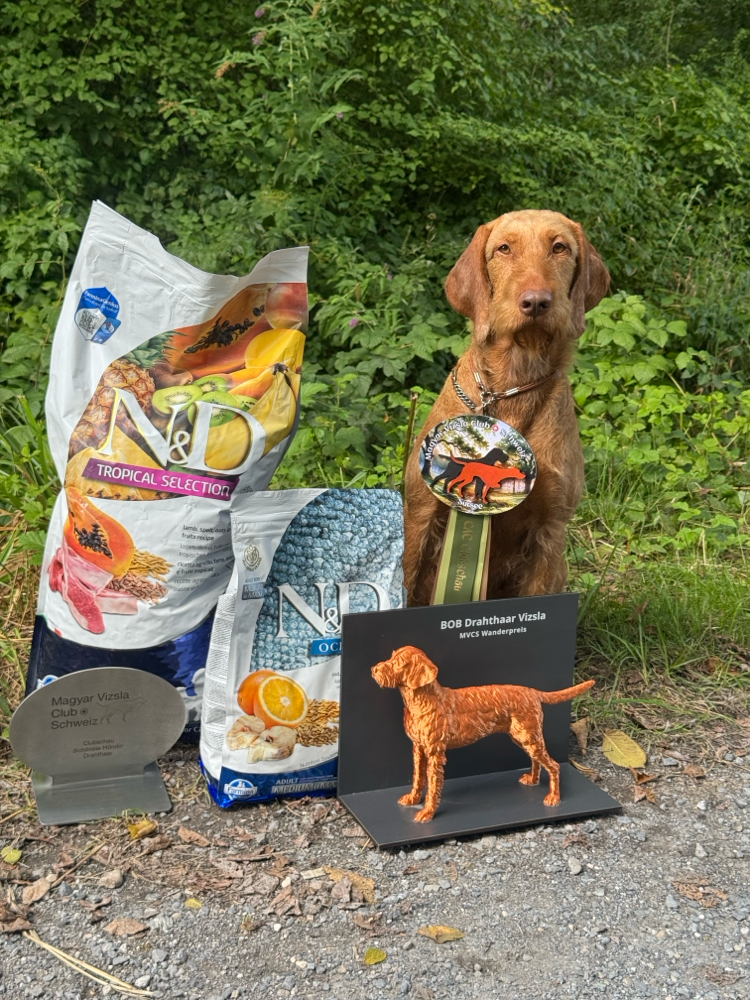 Sie ist eine gesunde Hündin mit keinerlei Allergien, was gerade bei den Drahthaarvizslas leider immer häufiger vorkommt.
